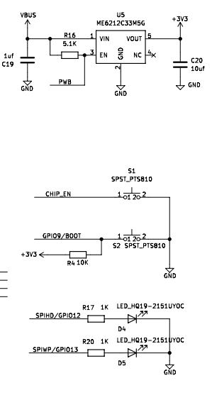 经过计算需要毫秒级的时间——而如果将充点电容从\(0.1\mu F\)提高一些这个时间还能增长!那么这就是说当复位信号触发阈值时我们一定能够保证BOOT引脚处于低电平的状态,就这样完成了进入烧录固件Bootloader的流程。而直接复位执行代码更加简单,只要放弃对于BOOT的所有操作即可。原理图之中还有一部分是关于手动触发BOOT和RESET的按钮和两个LED的没在这个部分中可以看到供电LDO和上文提到的BOOT引脚的上拉电阻: